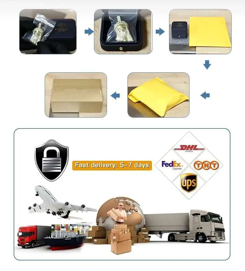 | Production Time | Ring: 7-10 days Earrings: 5-7 days Pendant: 10-15 days Cuban Chain: 10-15 days Tennis Chain: 7-10 days Watch: 20-25days |