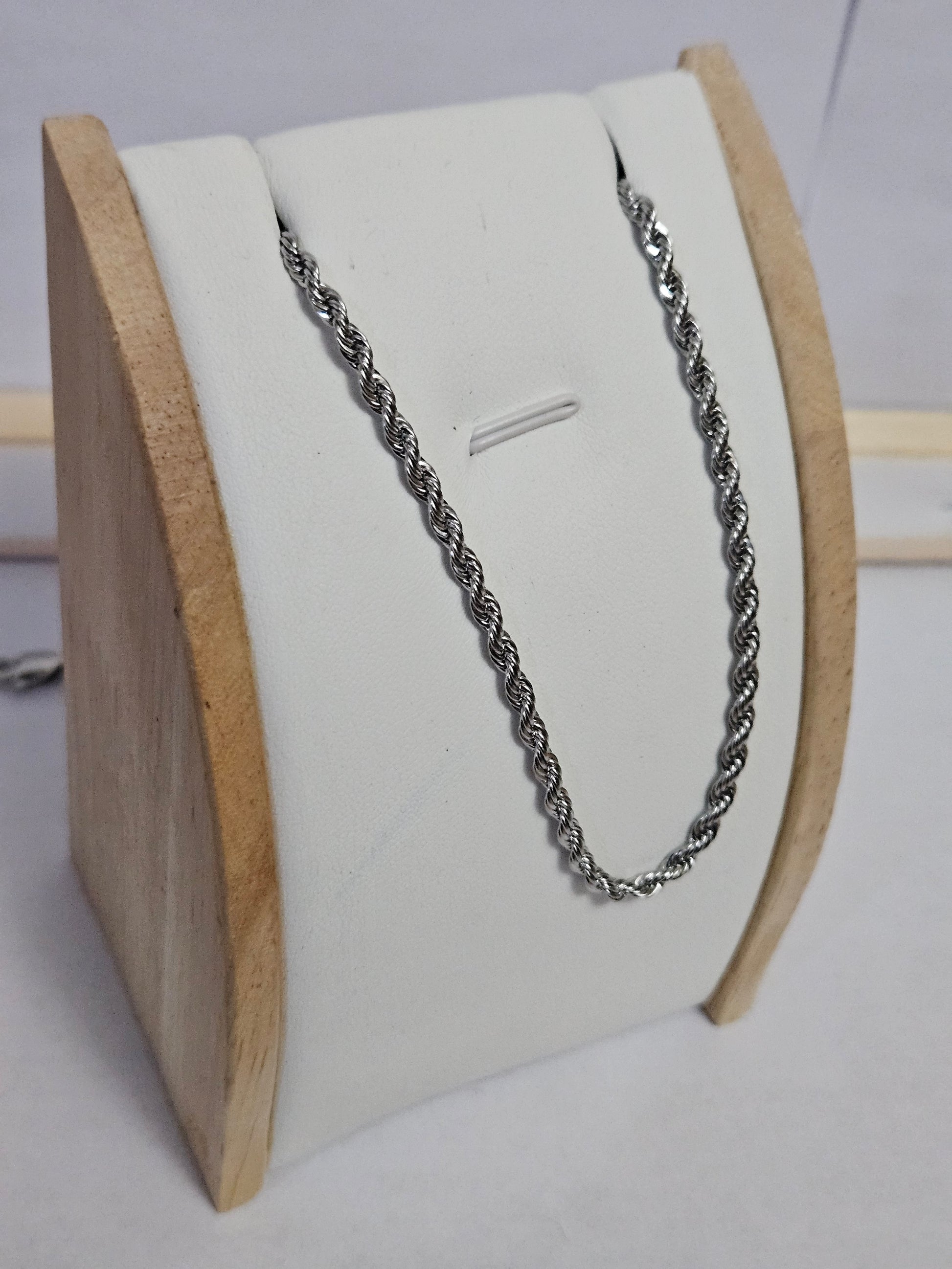 Elegant 3mm 22 inch rope chain necklace featuring luxurious 14k white gold electroplating over durable base metal. Classic twisted rope design creates brilliant light reflection and sophisticated texture. Lightweight yet substantial feel with secure clasp closure. Perfect for layering or wearing solo. Hypoallergenic finish resists tarnishing for long-lasting shine.